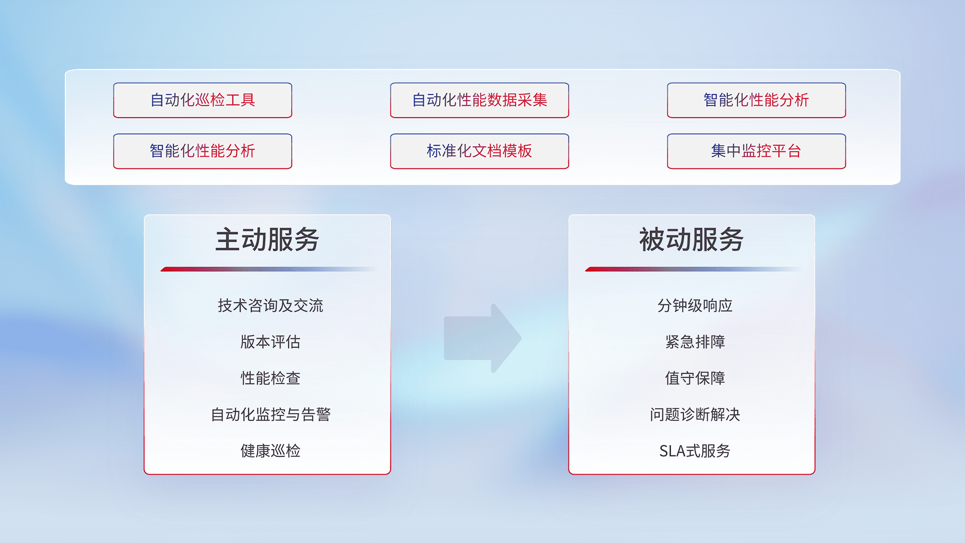 智能化工具和标准化文档,,,保障服务质量,,,提供主动服务(包含技术咨询、、、、版本评估、、、、性能检查、、、自动化监控与告警、、、、健康巡检)和被动服务包含(分钟级响应、、、紧急排障、、、值守保障、、问题诊断解决、、、、SLA服务)。。。。