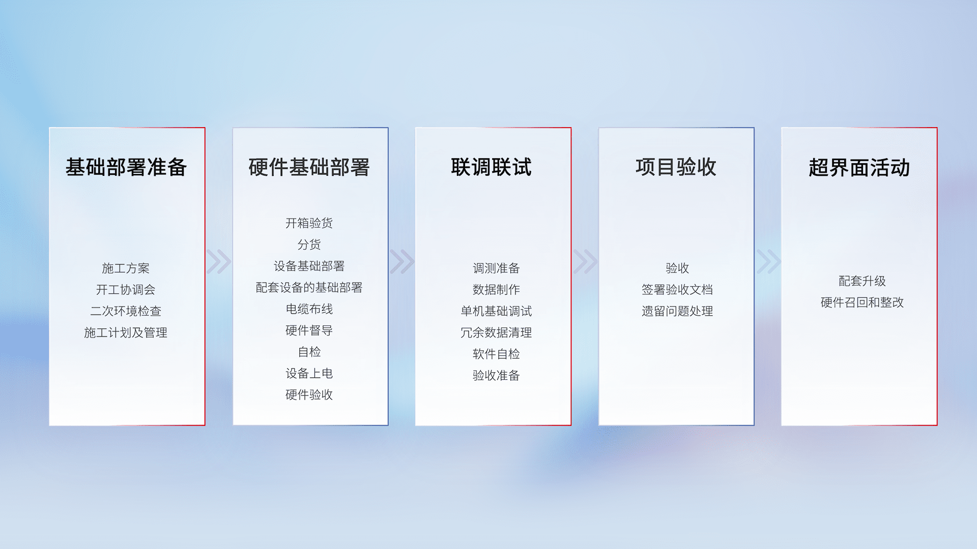 从基础部署准备、、硬件基础部署、、联调联试、、项目验收、、、越界面活动的全过程可追溯,,,保证施工质量和进度。。
